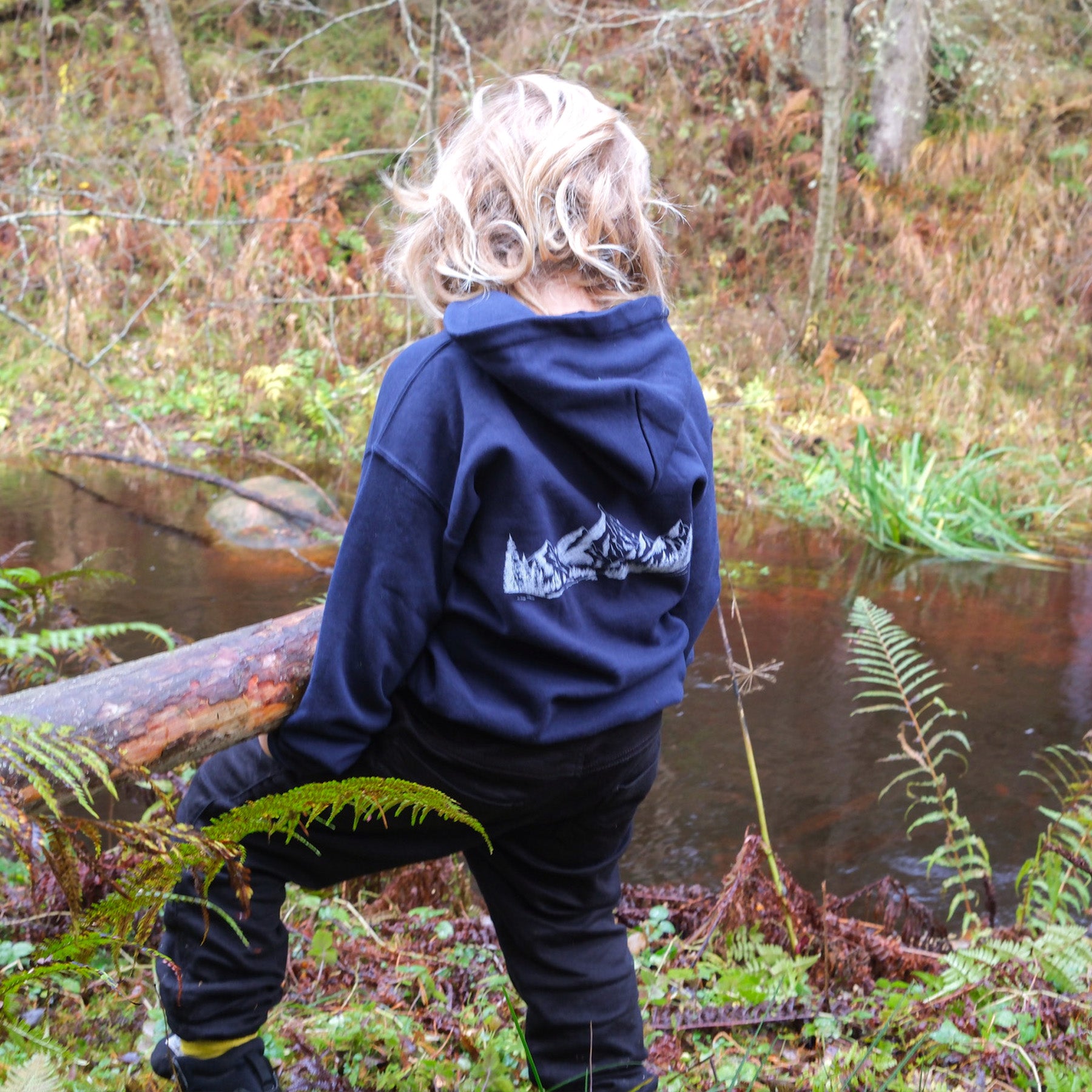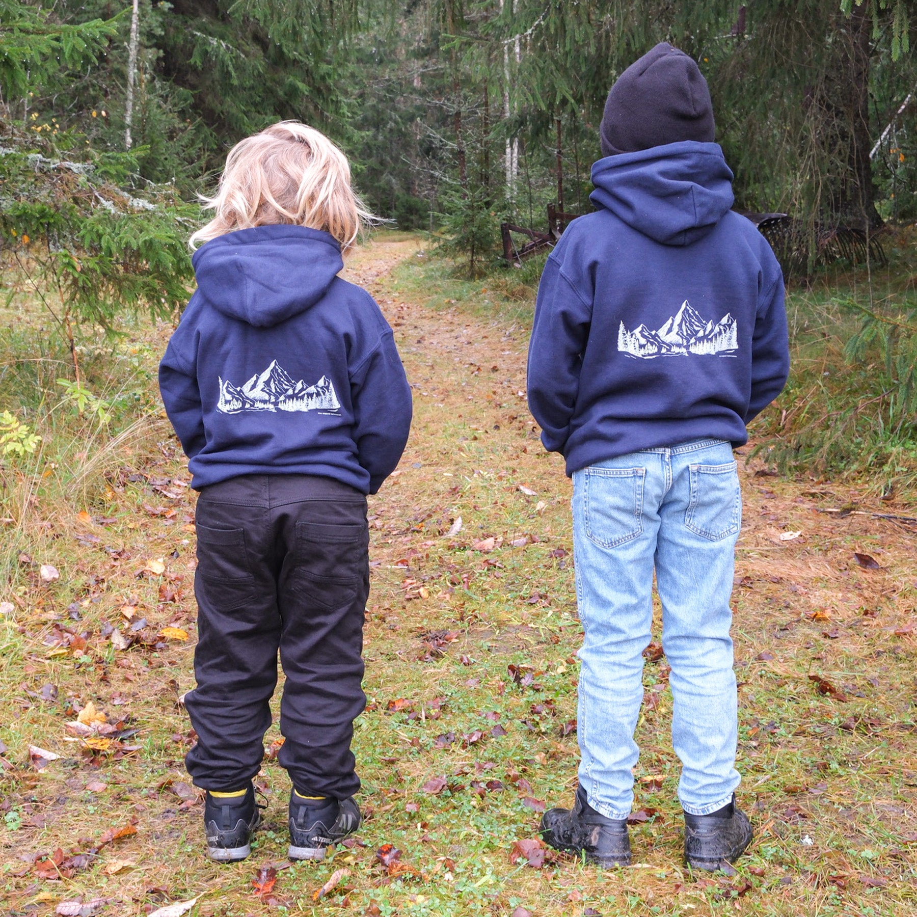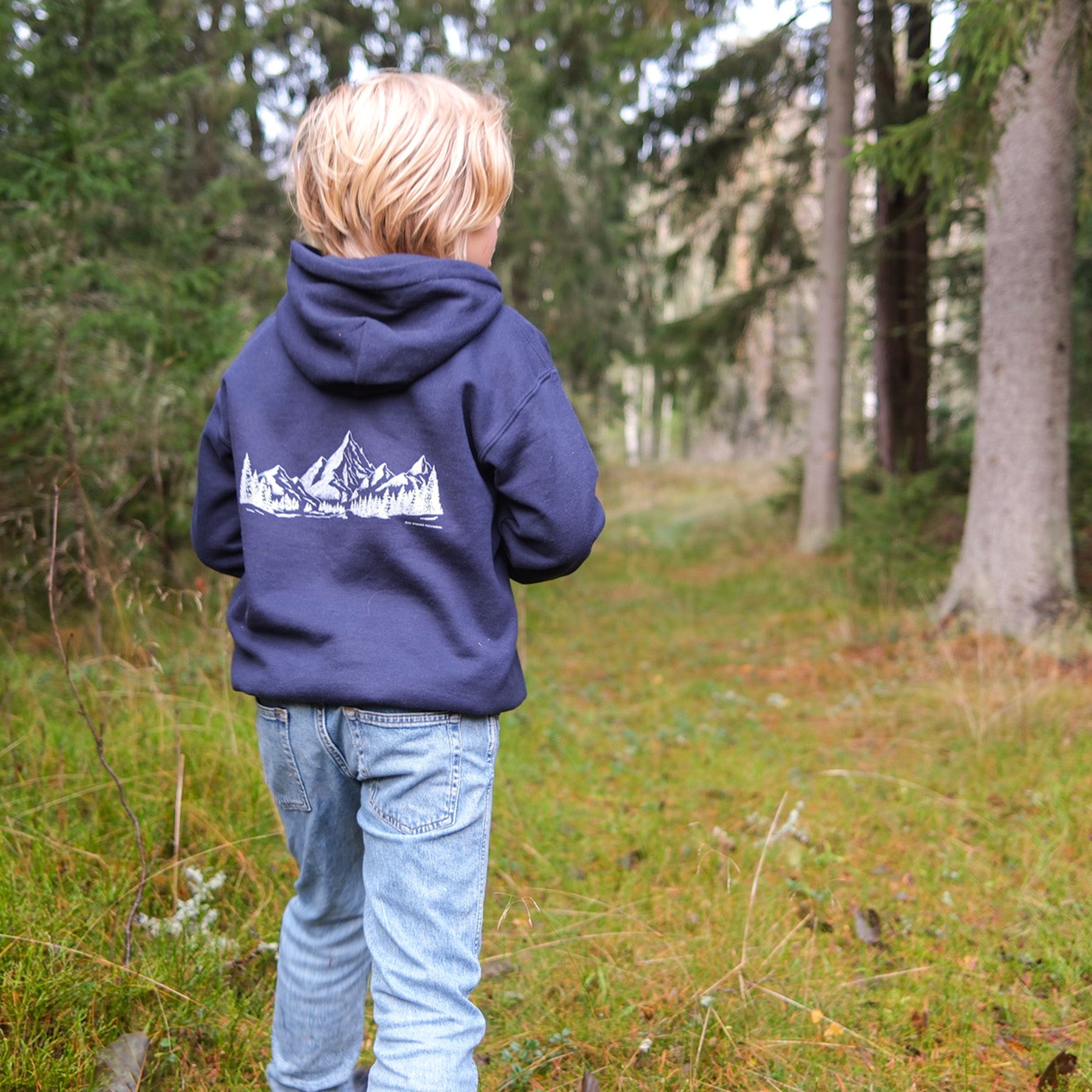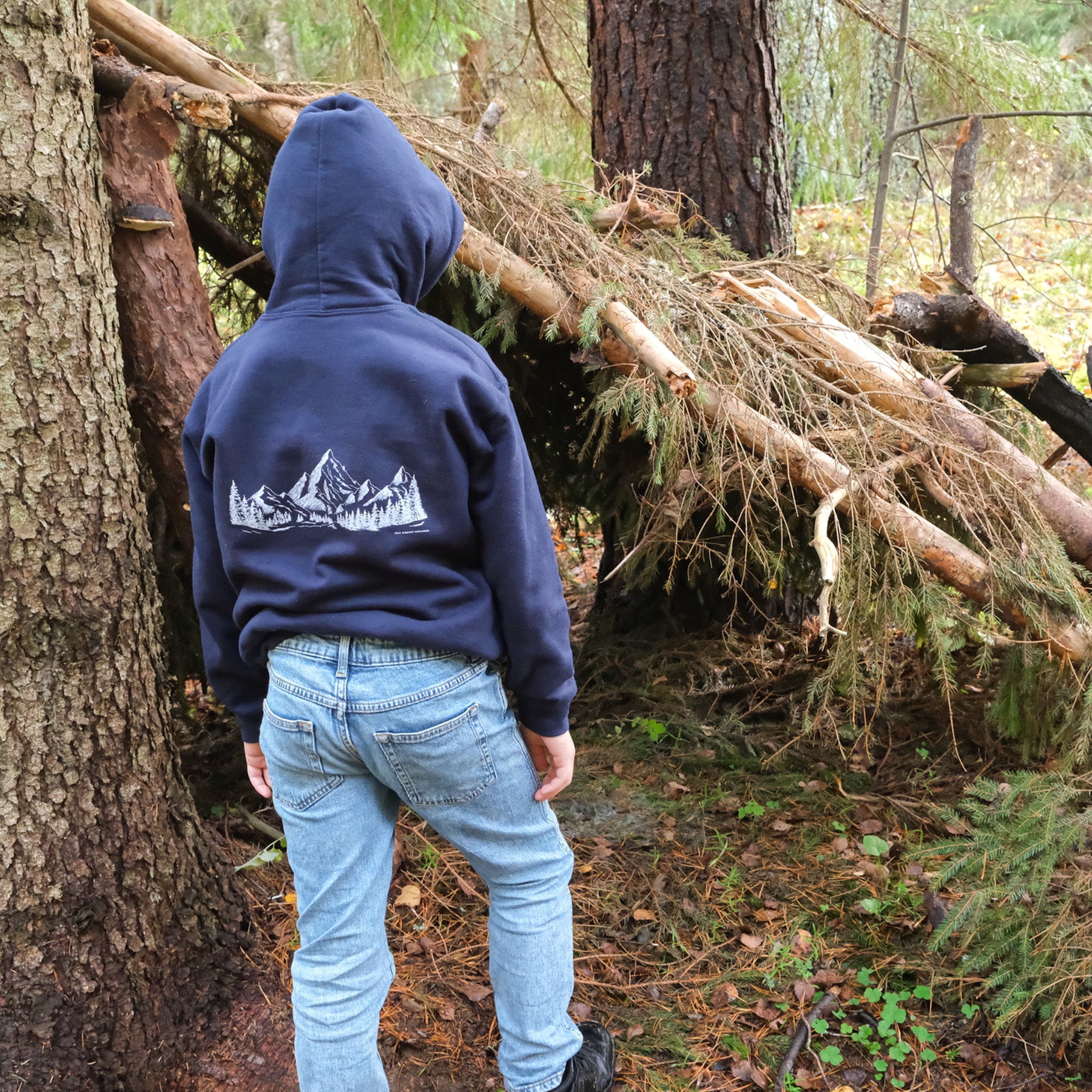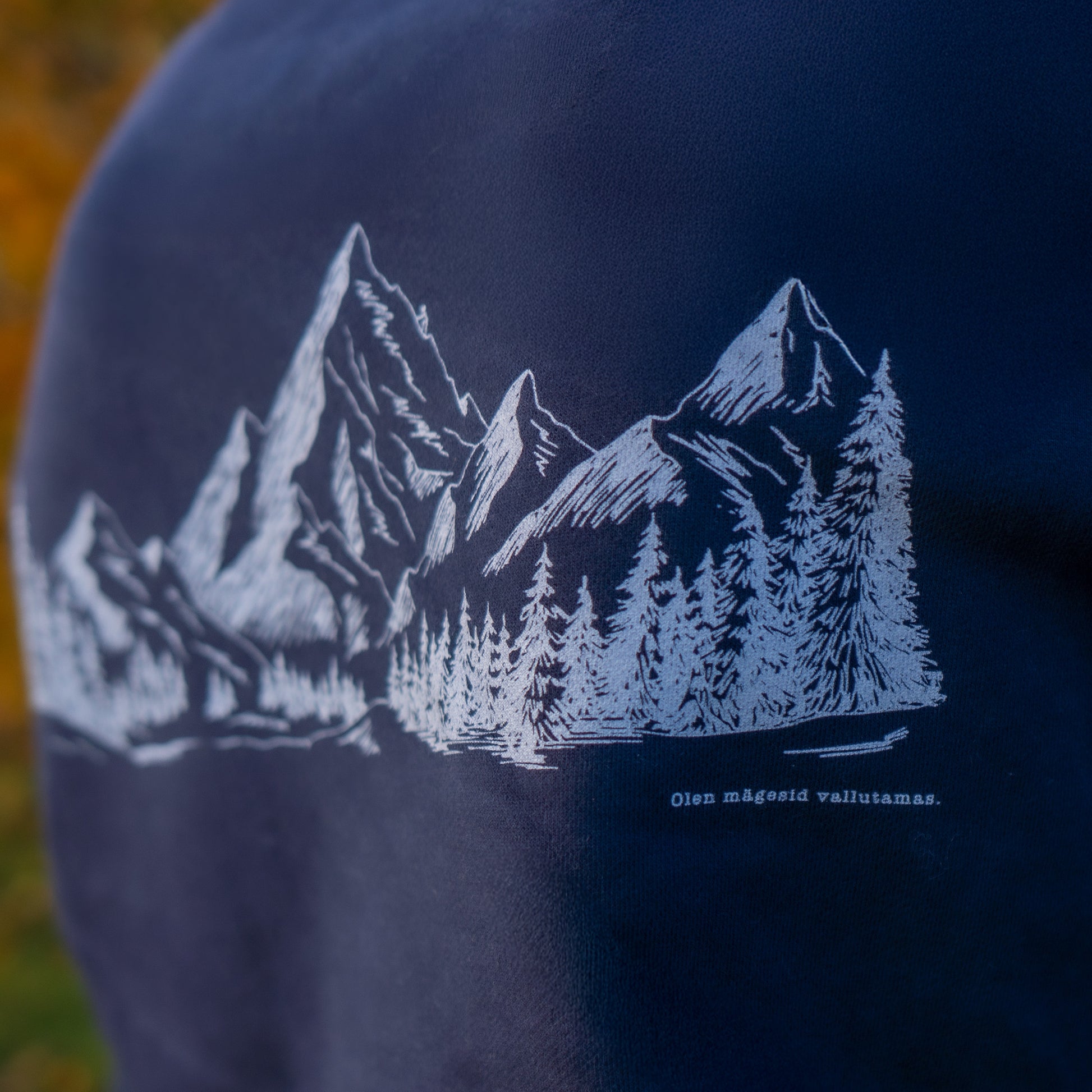 Laste suuruses tumesinine pusa koos Kozipi logo ning mägede disainiga seljal.