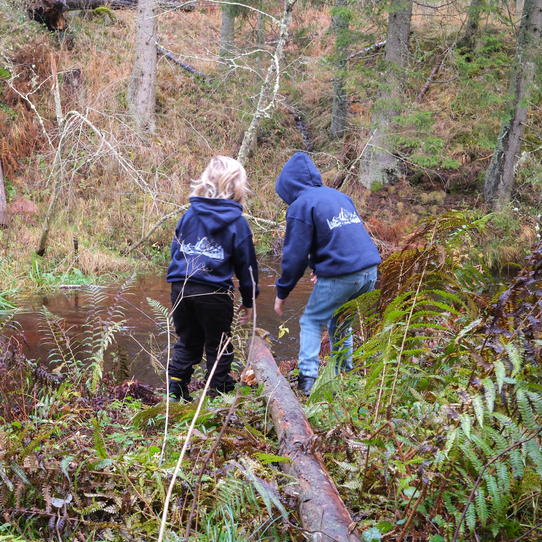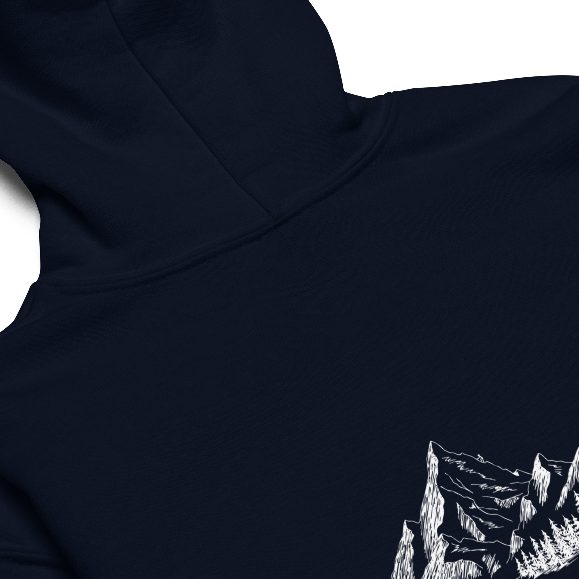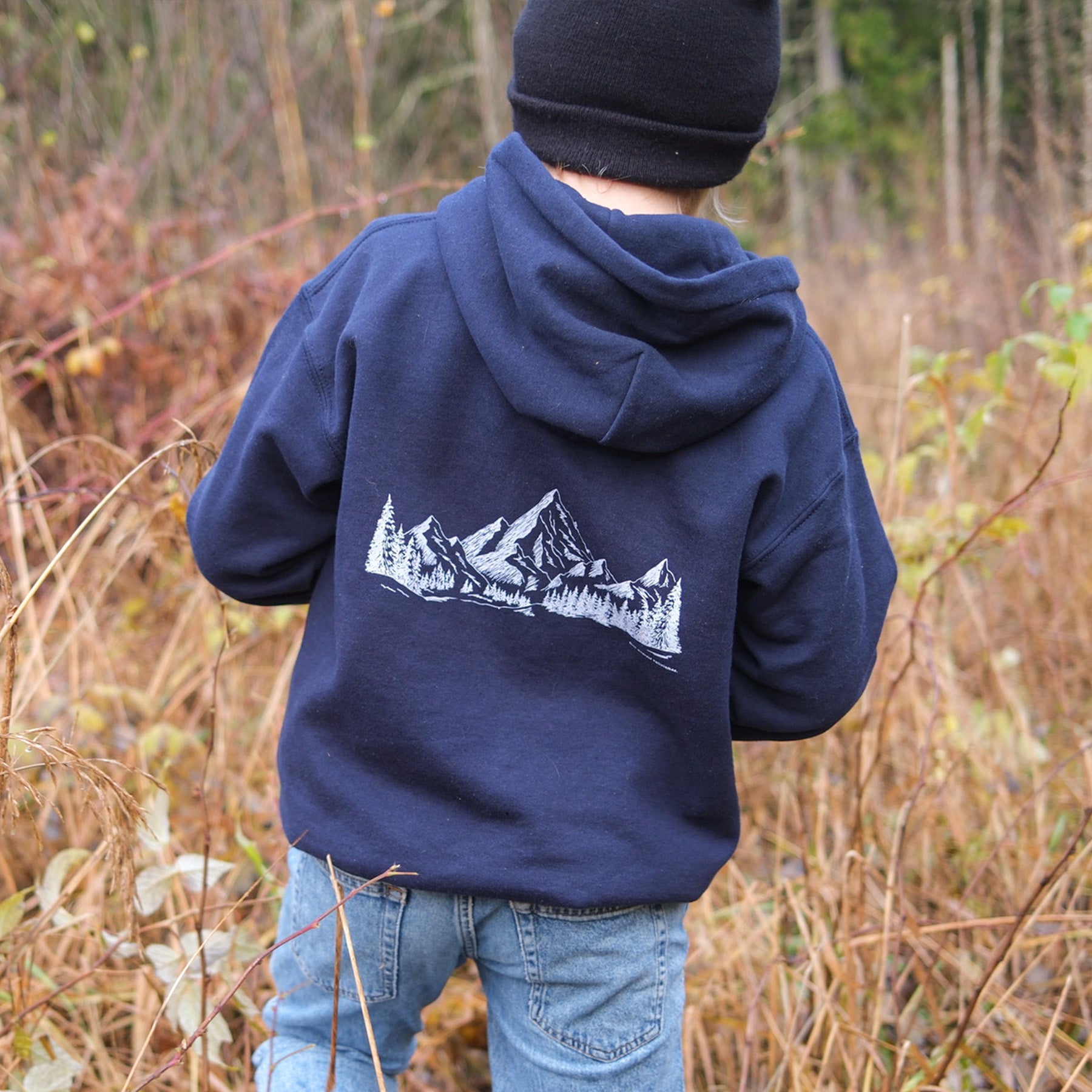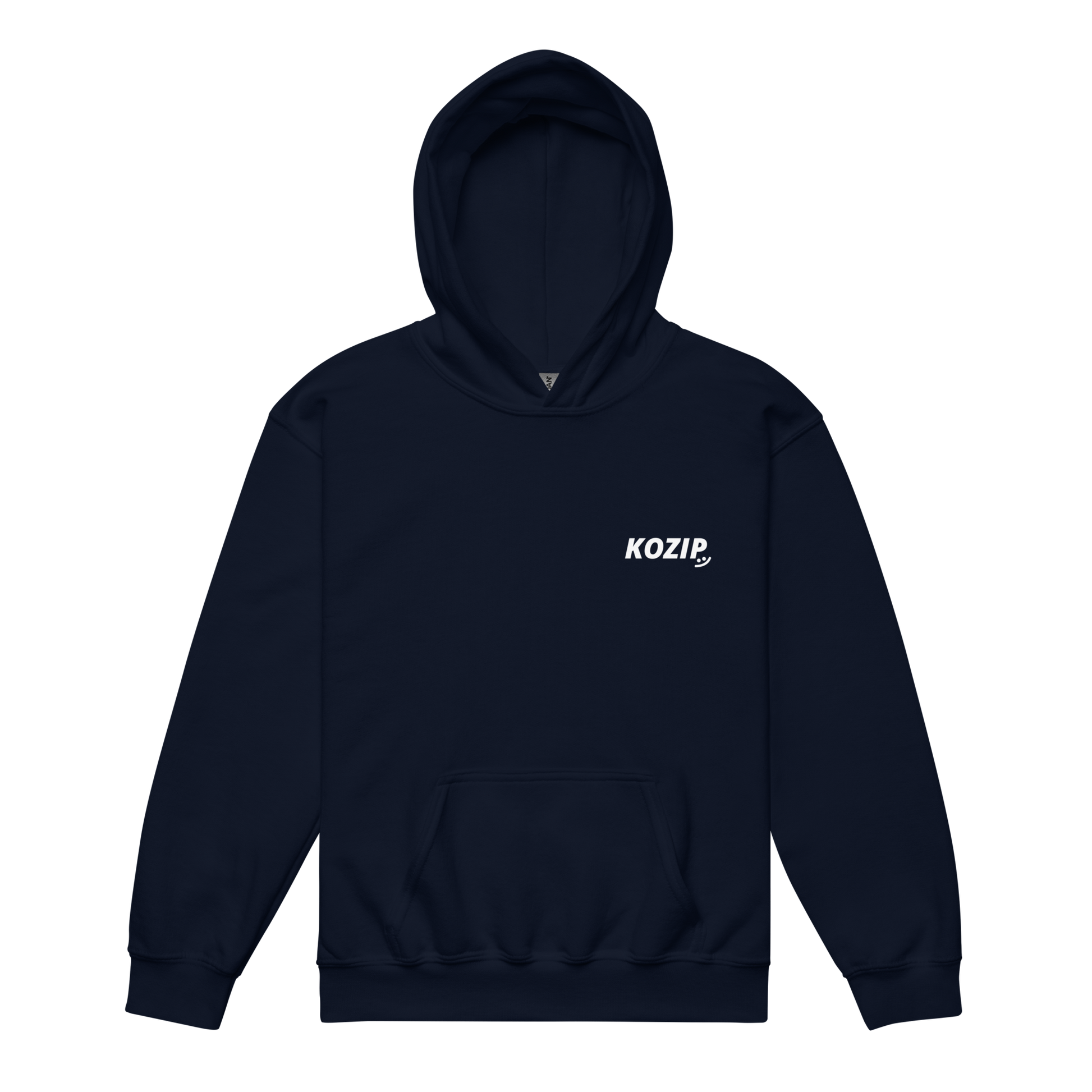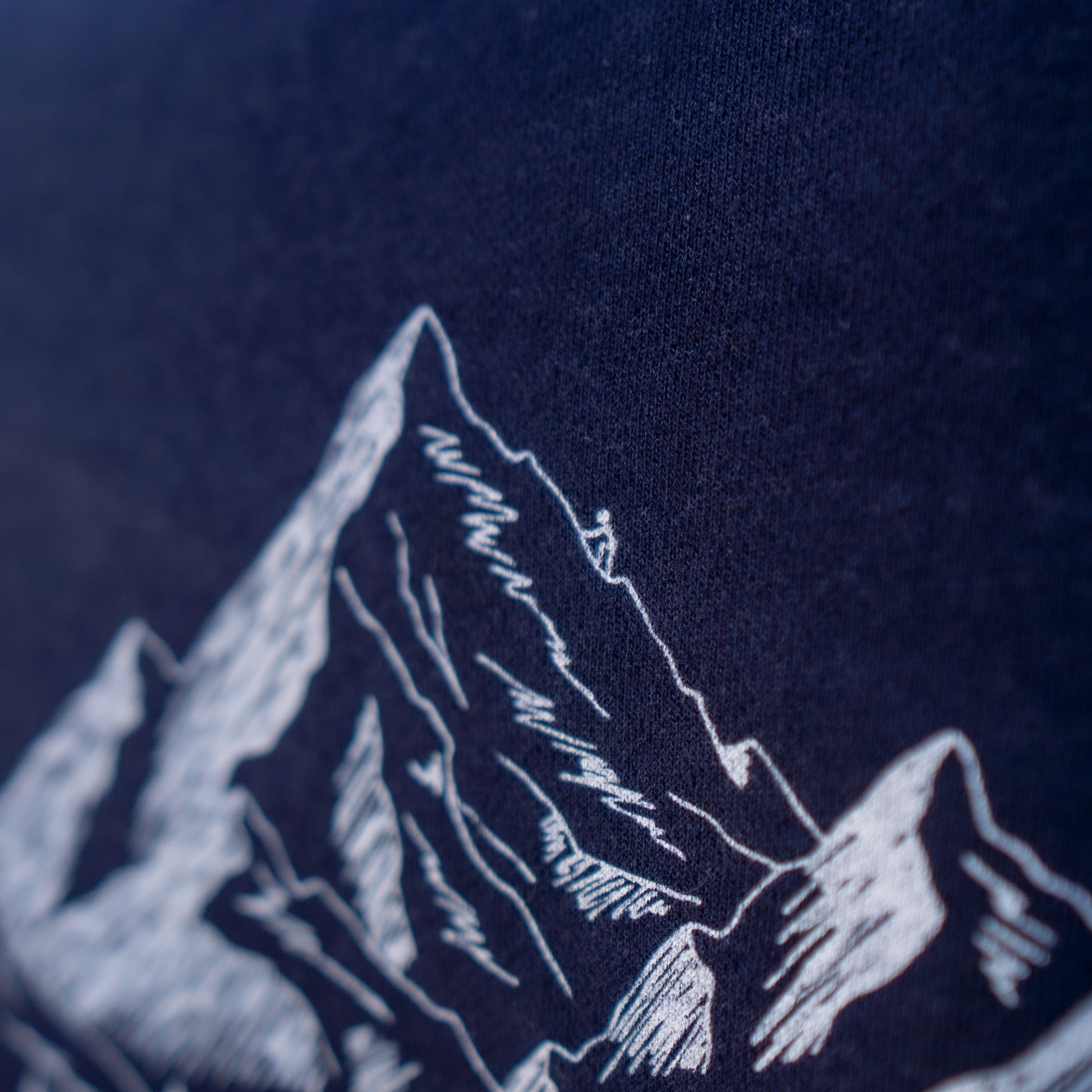Laste suuruses tumesinine pusa koos Kozipi logo ning mägede disainiga seljal.